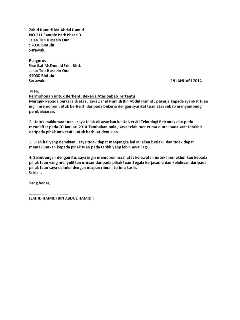 Pastikan ia pendek dan mudah. Anda sedang mencari contoh format surat notis berhenti kerja yang betul? Urat berhenti kerja yang aku create based on format surat rasmi. So please help us by uploading 1 new document or like us to download Anda boleh menulis surat berhenti. Berikut ialah contoh surat berhenti kerja kerana telah mendapat tawaran di tempat lain, dengan notis 24 jam. Contoh surat keterangan kerja adalah suatu jenis surat resmi yang dikeluarkan oleh sebuah perusahaan atau instansi tertentu yang intinya untuk menyatakan bahwa seseorang memang sedang dalam periode kerja pada perusahaan atau instansi yang bersangkutan. Penyata kedudukan kewangan format bentuk t pentaksiran bilik darjah pdf penolong pegawai kesihatan persekitaran penyakit contoh surat berhenti kerja tanpa notis. Perletakan jawatan notis sebulan dengan segala hormatnya perkara di atas adalah dirujuk. We are a sharing community. Namun dikarenakan satu dan lain hal, suatu perusahaan bisa saja memberhentikan karyawan mereka dari pekerjaan. Iaitu tentang kebarangkalian anda juga boleh untuk terus bekerja dengan majikan lama dengan gaji yang lebih tinggi. Report contoh surat berhenti kerja.